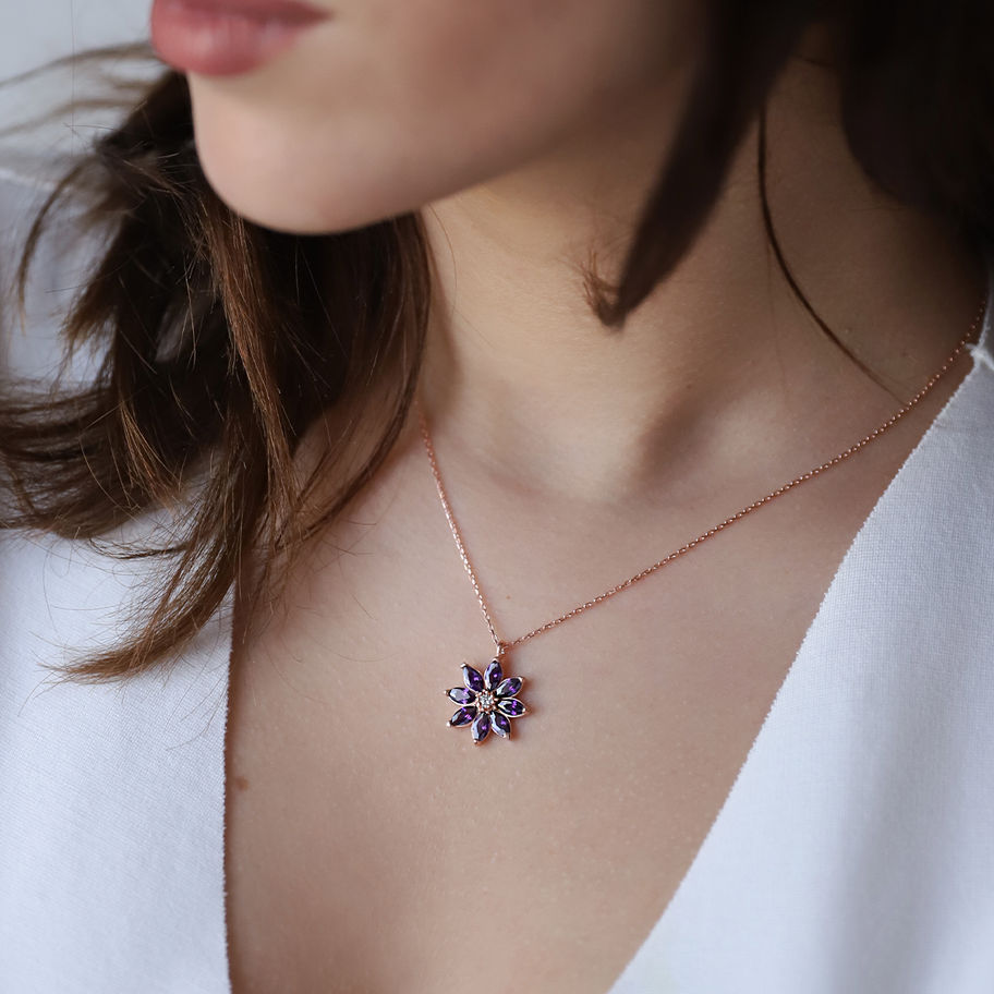 925 Ayar Gümüş Ametist Taşlı Papatya Kolye